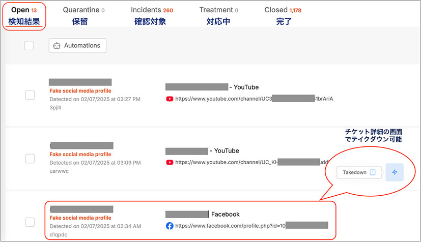 これまでAxurは数多くのプラットフォーマ―とAPI連携しており、年間50万件以上のテイクダウンを実施している。WebサイトやSNSでのブランド名やロゴなどの不正使用、フィッシングサイト、偽アプリなどを検知して顧客に通知し、顧客は管理画面で「テイクダウンボタン」をクリックするだけで、自動テイクダウンフローが即座に実行される。自動テイクタウンができない場合は、Axurからプラットフォーマ―にテイクダウンを依頼するが、テイクダウン完了まで平均9時間という。