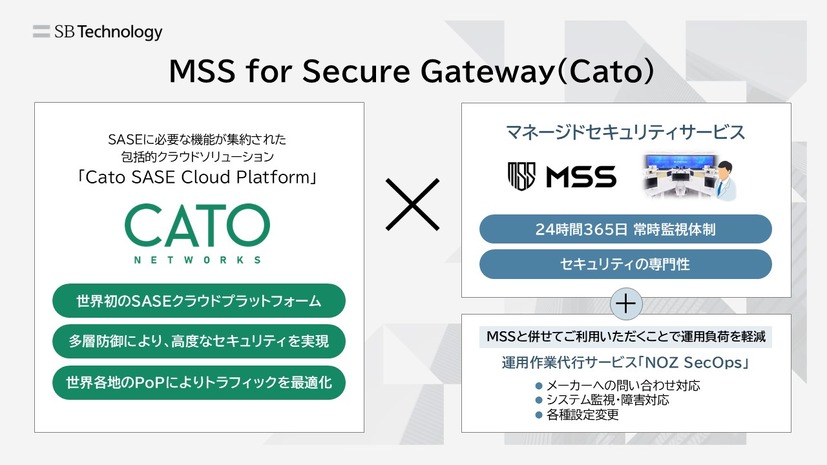 SBテクノロジー株式会社(SBT)は4月21日、SASEクラウドプラットフォーム「Cato SASE Cloud Platform」に対応したセキュリティ監視サービス「MSS for Secure Gateway(Cato)」を同日から提供すると発表した。