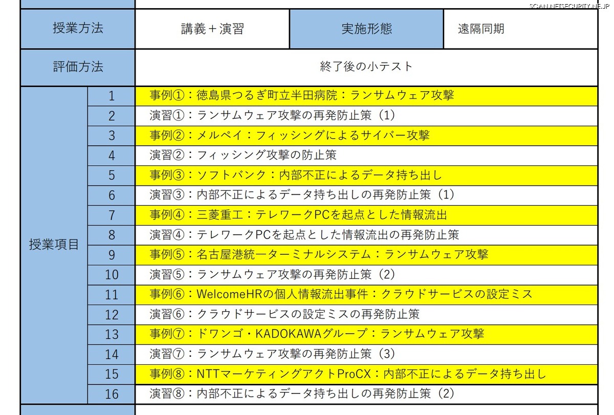 近年発生した国内の重大セキュリティインシデント(半田病院のランサムウェア被害、ソフトバンクの内部不正、名古屋港システムの被害など)を教材として、講義と演習を通じてその発生原因と再発防止策を学ぶ。単なる事例紹介に留まらず、攻撃者の動機・手口・侵入経路を「自分が攻撃者だったらどうするか?」という視点から分析。参加者は事前・発見・事後対策のタイムラインに沿って、現実的かつ実効性ある再発防止策を構築する力を養う。