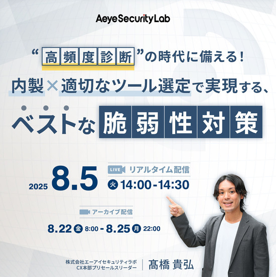 株式会社エーアイセキュリティラボは8月5日に、Webセミナー「“高頻度診断”の時代に備える! 内製×適切なツール選定で実現する、ベストな脆弱性対策」を開催すると発表した。