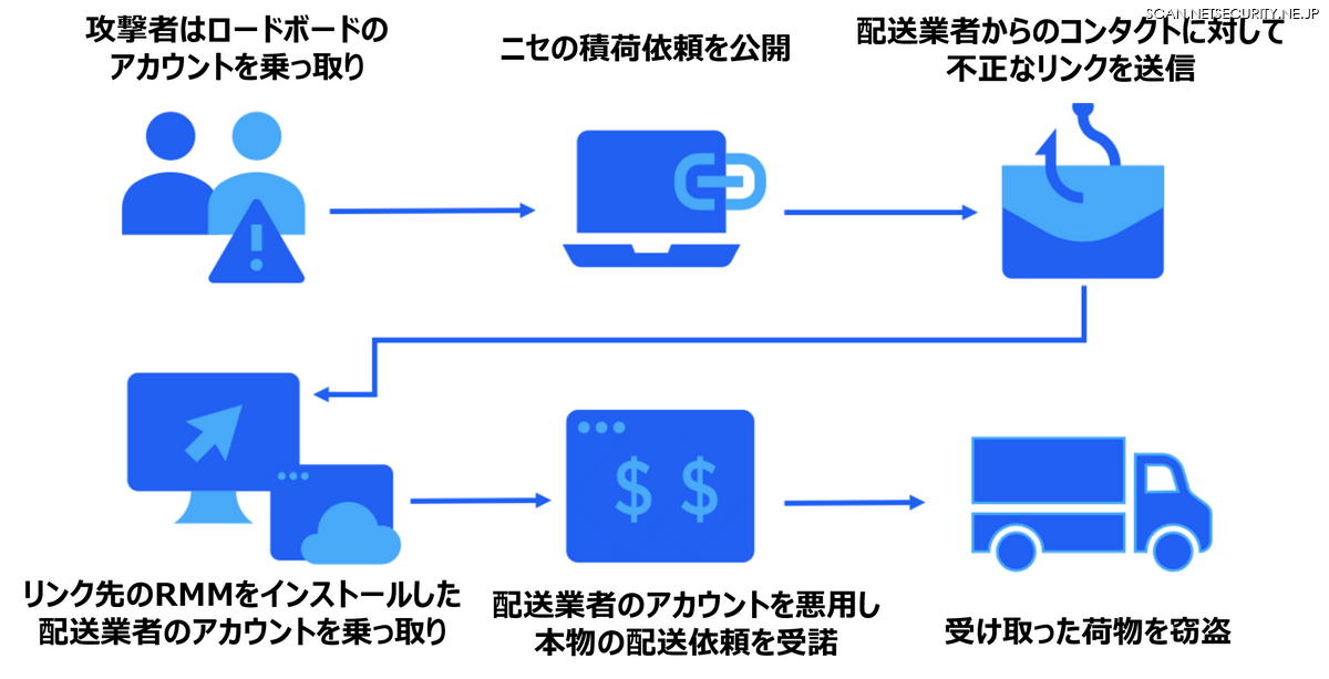 観測されたキャンペーンで確認された貨物窃盗の試みにつながる攻撃チェーンは、次のような流れです。脅威アクターはまず、ブローカーのロードボードアカウント(企業がトラック輸送のための積荷予約を仲介するマーケットプレイス)を侵害し、偽の積荷情報を投稿し、運送業者が反応した時点で攻撃チェーンを開始します。