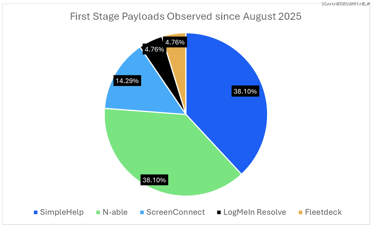 貨物窃盗の疑いがあるこの脅威クラスターは、少なくとも2025年6月から活動しており、証拠によるとこのグループの攻撃キャンペーンは早くも1月には始まっていたとみられます。この脅威アクターは、ScreenConnect、SimpleHelp、PDQ Connect、Fleetdeck、N-able、LogMeIn Resolveなど、さまざまなRMMツール(場合によってはリモートアクセスソフトウェア)を配布しています。これらのRMM/RASはしばしば併用されており、たとえばPDQ ConnectがScreenConnectとSimpleHelpの両方をダウンロードおよびインストールする例が観測されています。初期アクセスが確立されると、脅威アクターはシステムおよびネットワークの偵察を行い、WebBrowserPassViewなどの認証情報収集ツールを展開します。これらの活動は、標的環境内でのアカウント侵害やアクセス拡大を目的とした広範な取り組みを示しています。