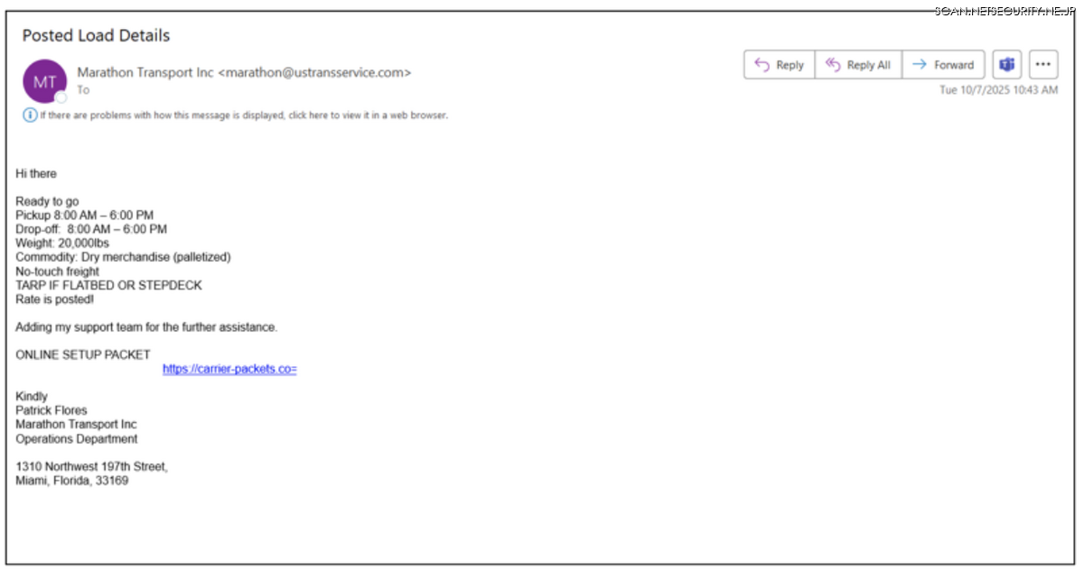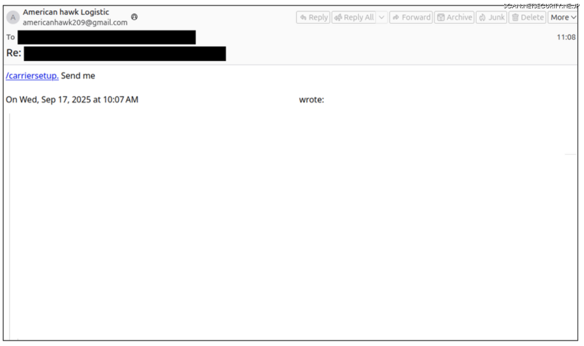 (3)メールキャンペーンによる直接攻撃: このクラスターは、大規模事業体を対象とした直接的なメールキャンペーンも実施しており、対象には資産を保有する運送業者、貨物仲介会社、統合サプライチェーンプロバイダーが含まれます。これらの事業体へのアクセスを得ることで、攻撃者は高価値な貨物を特定したり、さらなる目的(たとえばロードボード上で不正な積荷を投稿するなど)を達成する新たな機会を発見する可能性があります(図5参照)。