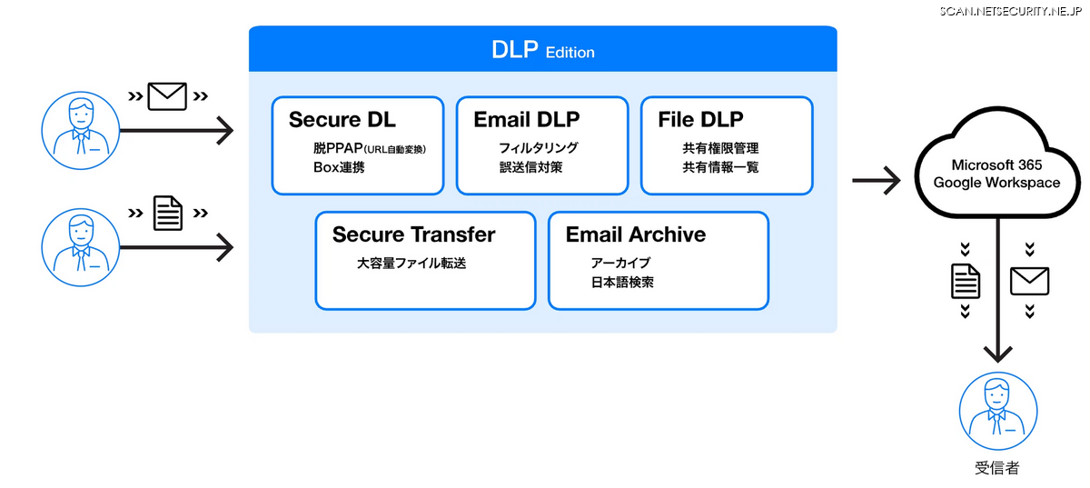 DLP Edition: 電子メールでやり取りする情報や組織内に散在するデータの、意図せぬ情報漏えいを防止します。PPAPと呼ばれる、セキュリティ上推奨されないメールの添付ファイルのやり取りから脱却するのを支援します。メールの添付ファイルを自動的にクラウドにアップロードし、セキュアにダウンロードできるようになります。 DLP(ディーエルピー)とは、Data Loss Preventionの略で、データ損失防止を意味します。