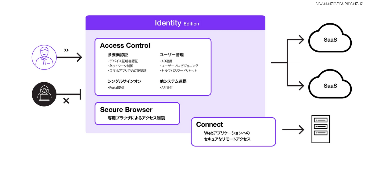 Identity Edition: 利用が急増しているSaaSへのアクセス制御とシングルサインオンで、従業員の安全な働き方を支えるアクセス管理を実現します。オフィスでもリモートでも同じIT環境を実現する基盤であり、最近話題のゼロトラストを構成する重要な要素です。オンプレミスのシステムも管理でき、IT担当者によるID管理の負担も軽減します。