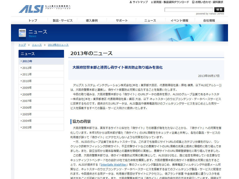 ALSIは、大阪府警察本部と連携し、偽サイト被害防止対策に協力すると発表した。