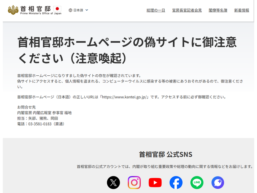 首相官邸は10月22日、首相官邸ホームページの偽サイトへの注意喚起を発表した。