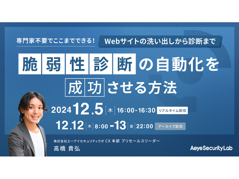 株式会社エーアイセキュリティラボは12月5日に、オンラインセミナー「専門家不要でここまでできる!Webサイトの洗い出しから診断まで脆弱性診断の自動化を成功させる方法」を開催すると発表した。
