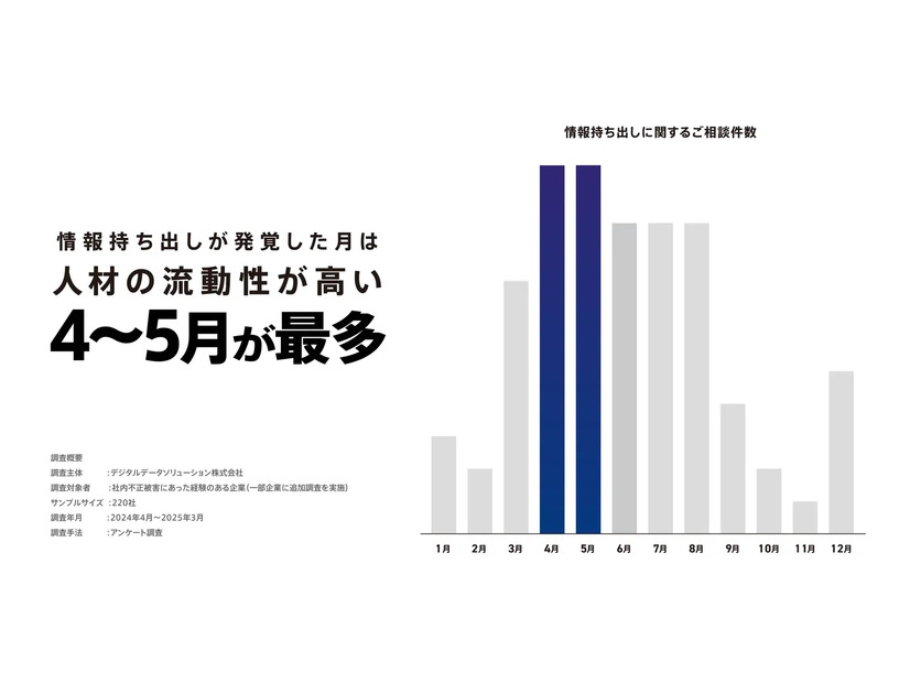 デジタルデータソリューション株式会社は4月23日、社内不正・情報持ち出し被害の実態を明らかにするために2024年度に社内不正被害にあった経験のある企業220社を対象に実施した実態調査の結果を発表した