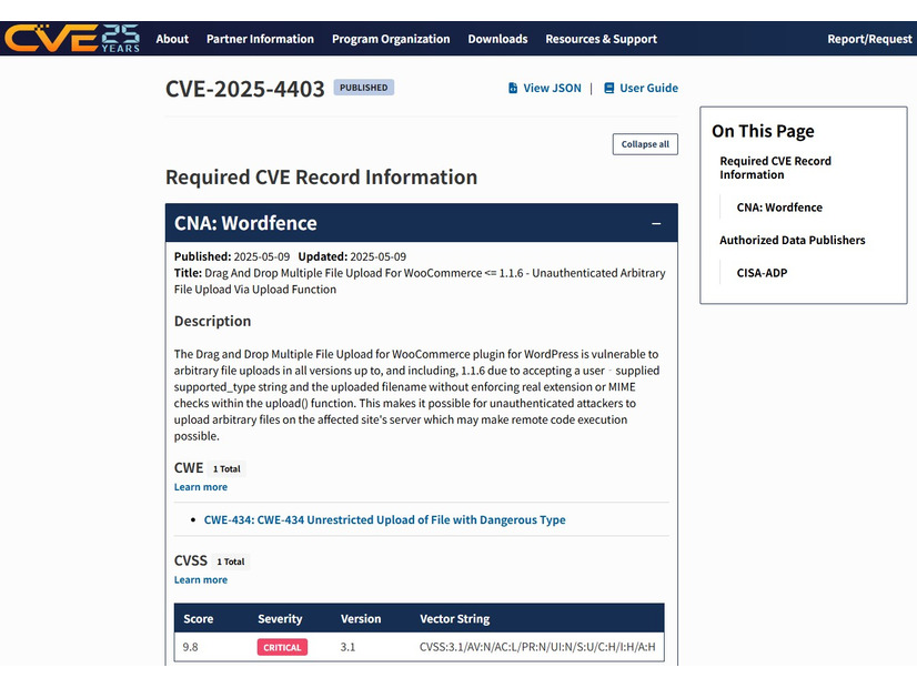Wordfenceは現地時間5月8日、WordPress用プラグイン「The Drag and Drop Multiple File Upload for WooCommerce plugin for WordPress」におけるリモートコード実行につながる任意ファイルアップロードの脆弱性について発表した。