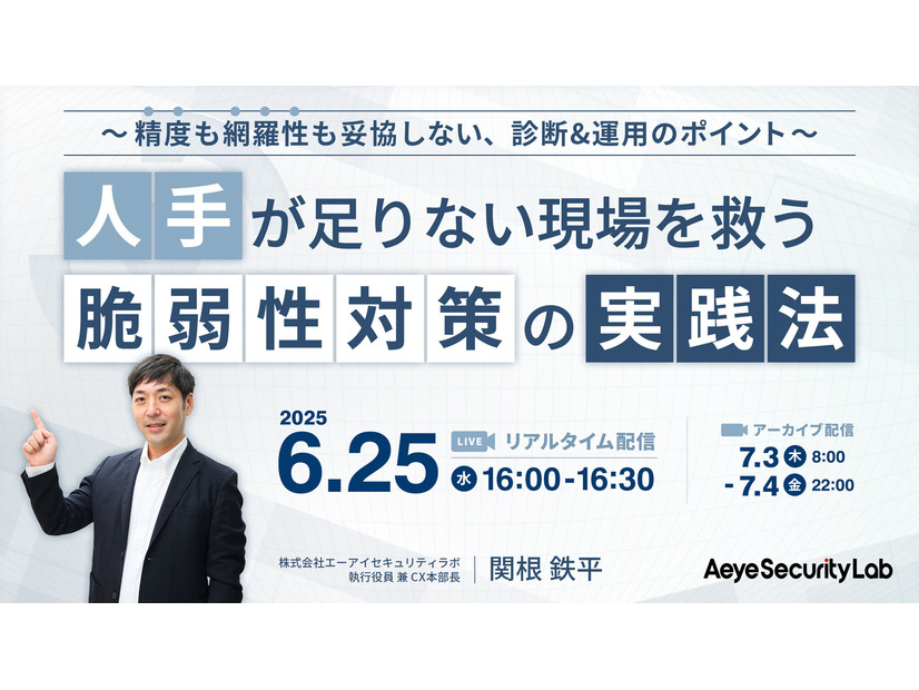 株式会社エーアイセキュリティラボは6月25日に、ウェビナー「人手が足りない現場を救う、脆弱性対策の実践法~精度も網羅性も妥協しない、診断&運用のポイント~」を開催すると発表した。7月3日からアーカイブ配信も行う。
