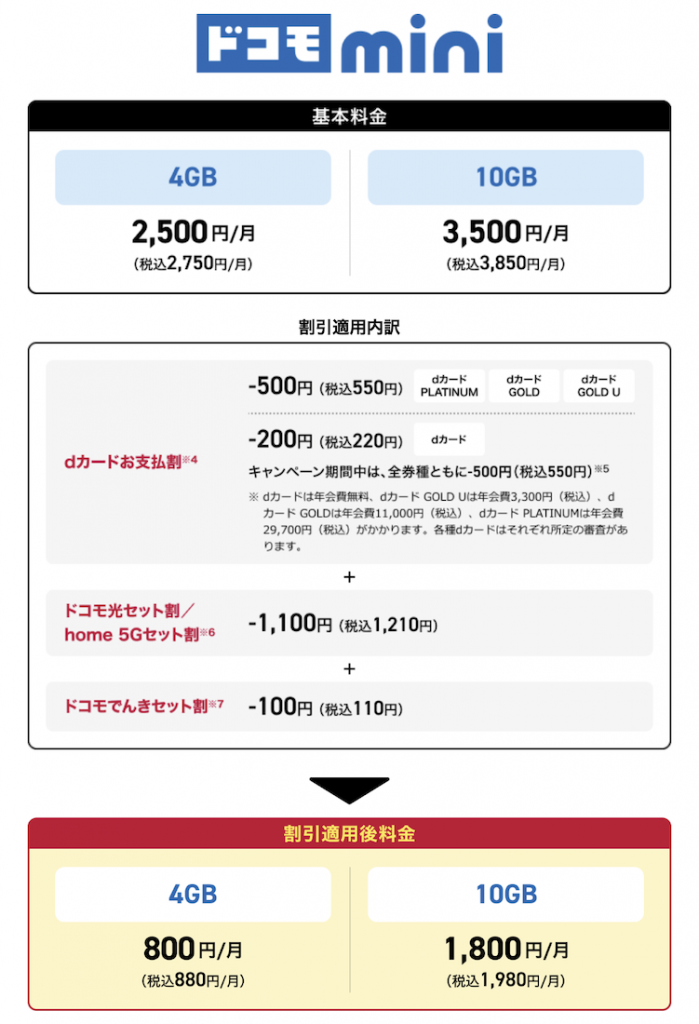 ドコモmini:4GB/2,750円(割引後880円)、10GB/3,850円(割引後1,980円)