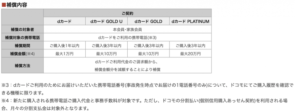 | 補償サービス | dカード | dカード GOLD U | dカード GOLD | dカード PLATINUM |