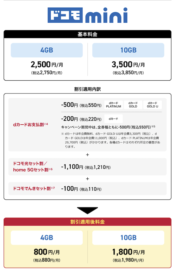 - 月10GB以下ならドコモ mini!割引適用で安く収まる+ドコモ品質も魅力。