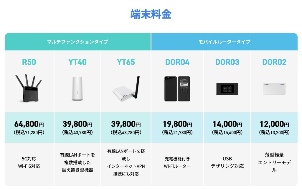 | DOR02 | モバイルルータータイプ 13,200円 |
