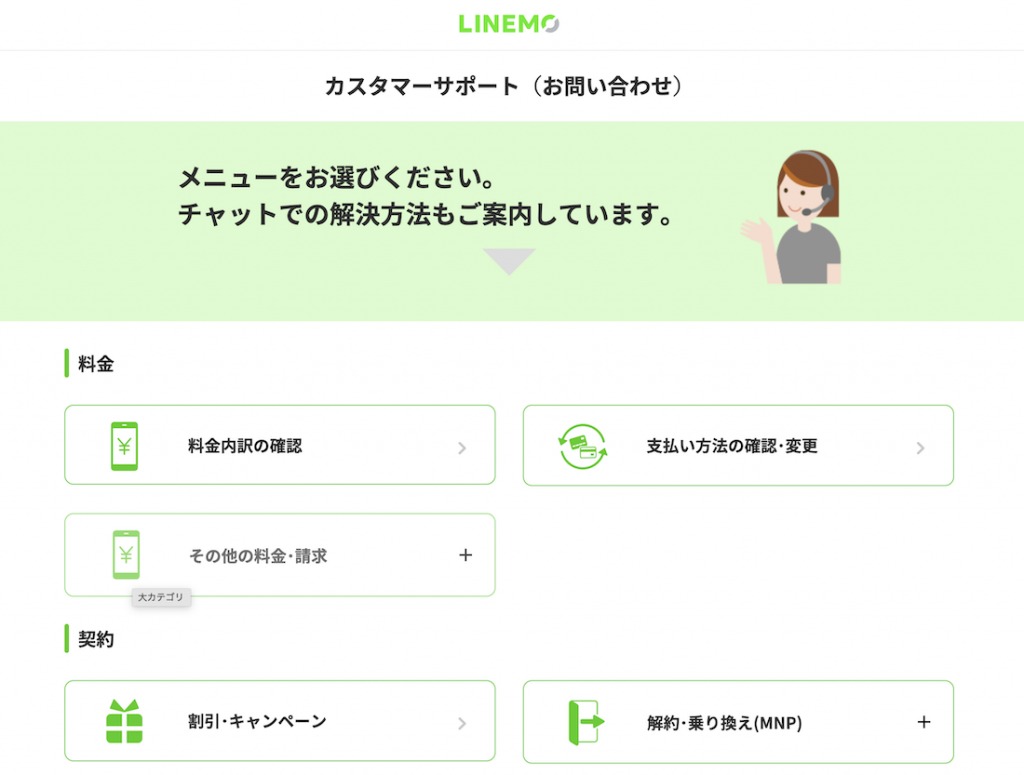 解約につまづいた場合はLINEMOのカスタマーサポートから項目を選び、チャットサポートに進みましょう。