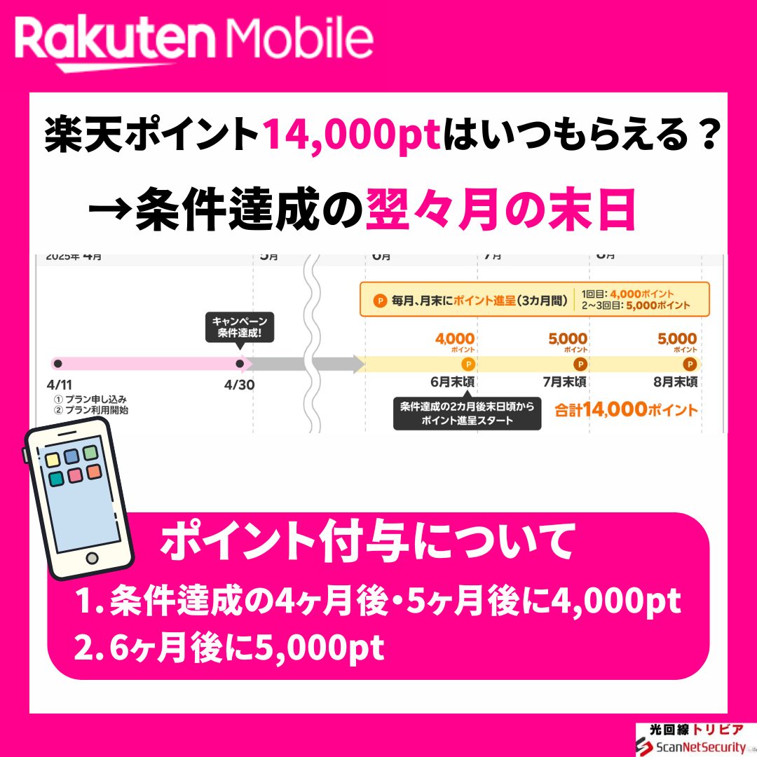 楽天モバイル「三木谷キャンペーン」は、以前は条件達成から4か月後末頃にポイント進呈開始でした。