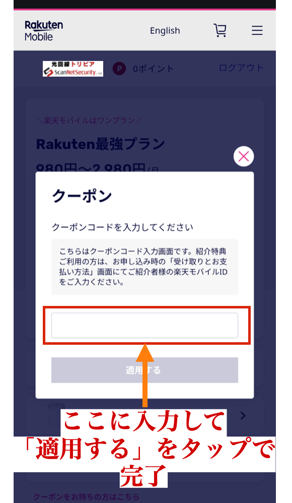 - 紹介ログイン後、三木谷キャンペーンのクーポンコードを入力