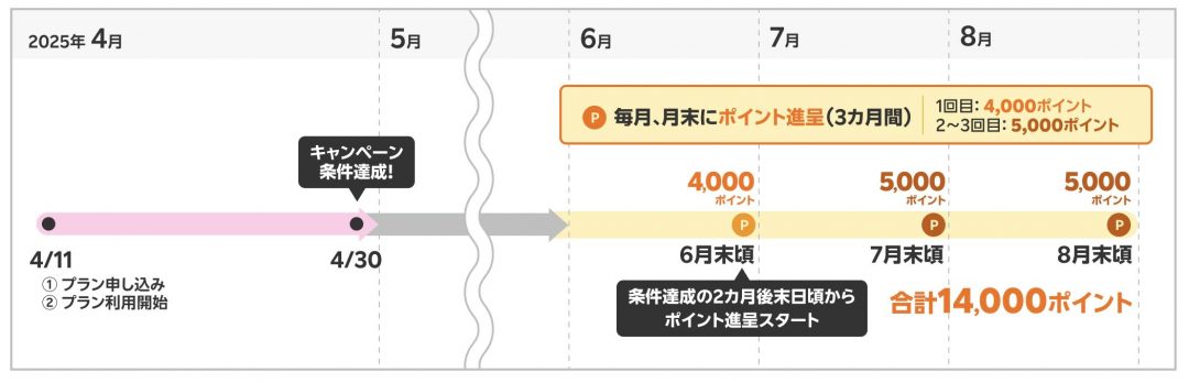 4000ポイント、翌月に5000ポイント、その翌月に5000ポイントと、3か月にわたり合計14,000ポイントが進呈(※乗り換え以外だと11,000ポイント)。