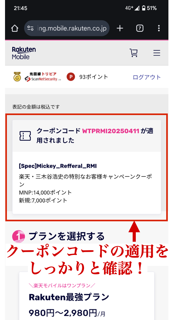 「Rakuten最強プランお申し込み」ボタンを押して、次の画面でクーポンコードが適用されていればOKです!