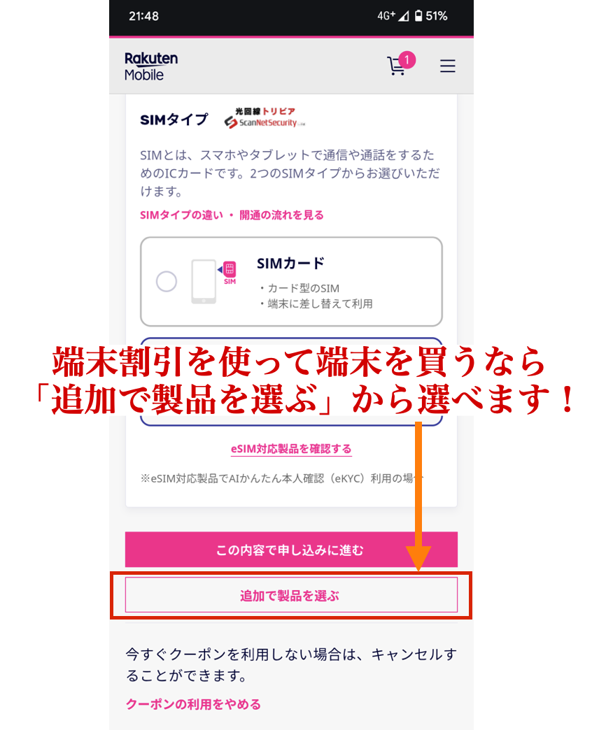 三木谷キャンペーンと一緒に端末を購入する場合は、一番下までスクロールすると「追加で製品を選ぶ」が表示されるので、そこから製品を選びましょう。