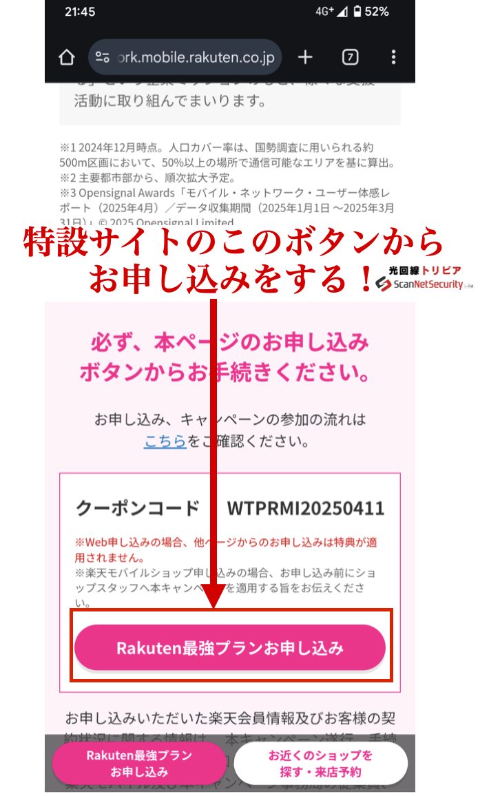 必ず本物の三木谷キャンペーン専用の特設サイトから申し込んで、クーポンコード自動適用でサクッと契約しちゃいましょう。