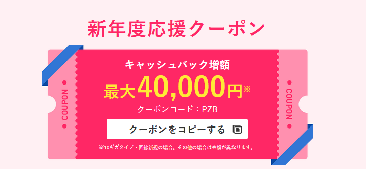 | キャンペーン・ キャッシュバック | 10ギガ:クーポン利用で最大105,000円(事業者変更の場合) 1ギガ:クーポン利用で最大64,000円(事業者変更の場合) |