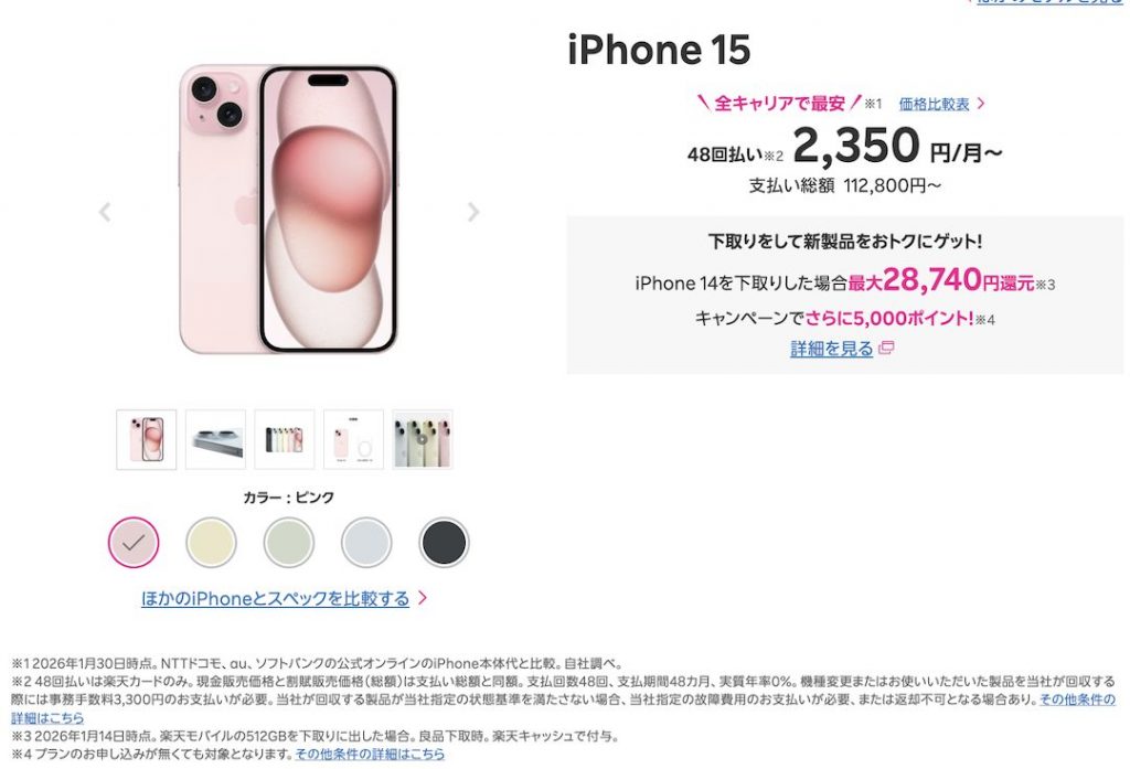 iPhone15は、楽天モバイルだと、48回払いにすると月々2,350円からの支払いです。(2026年2月7日現在)
