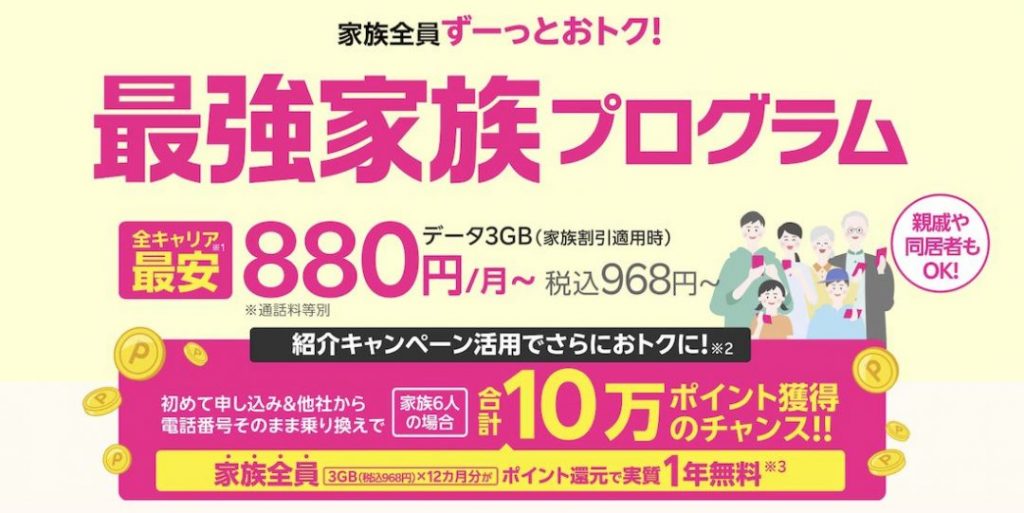 そして、紹介キャンペーンと併用可能で、家族を専用URLから紹介する事で楽天ポイントもゲットできます。(※家族割はデータタイプも対象ですが、紹介キャンペーンはデータタイプは対象外なので要注意。)