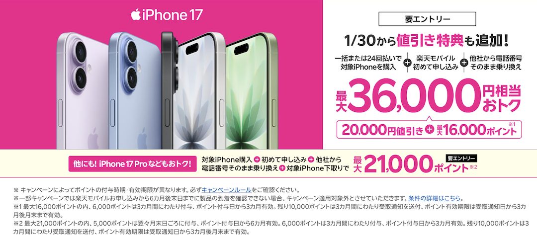 最新iPhone17購入で最大36,000円相当お得:対象のiPhone17シリーズ購入+初めて申込+MNP乗り換え+対象iPhone下取り
