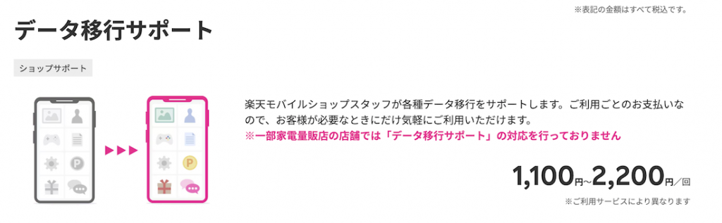 楽天モバイルの店舗には有料(1,100円〜2,200円/回)の「データ移行サポート」というサービスがあります。