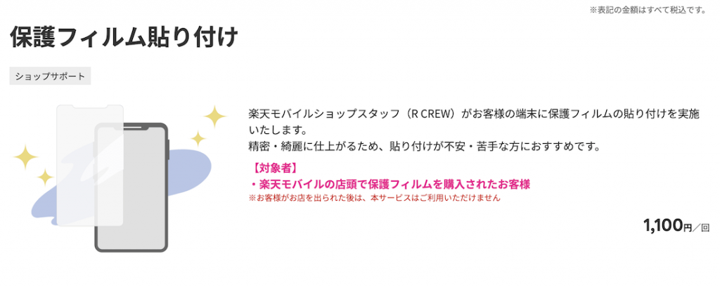 楽天モバイル店舗では有料で保護フィルムの貼り付けやガラスコーティングなどのサービスが受けられます。