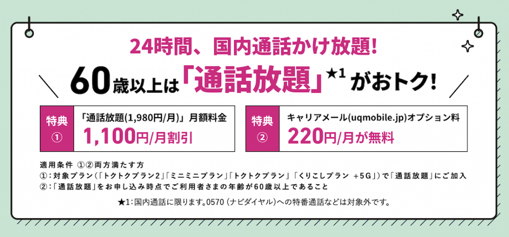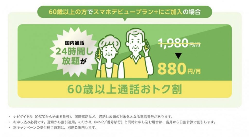 ワイモバイルやUQモバイルには高齢者向けの通話定額割引があります。