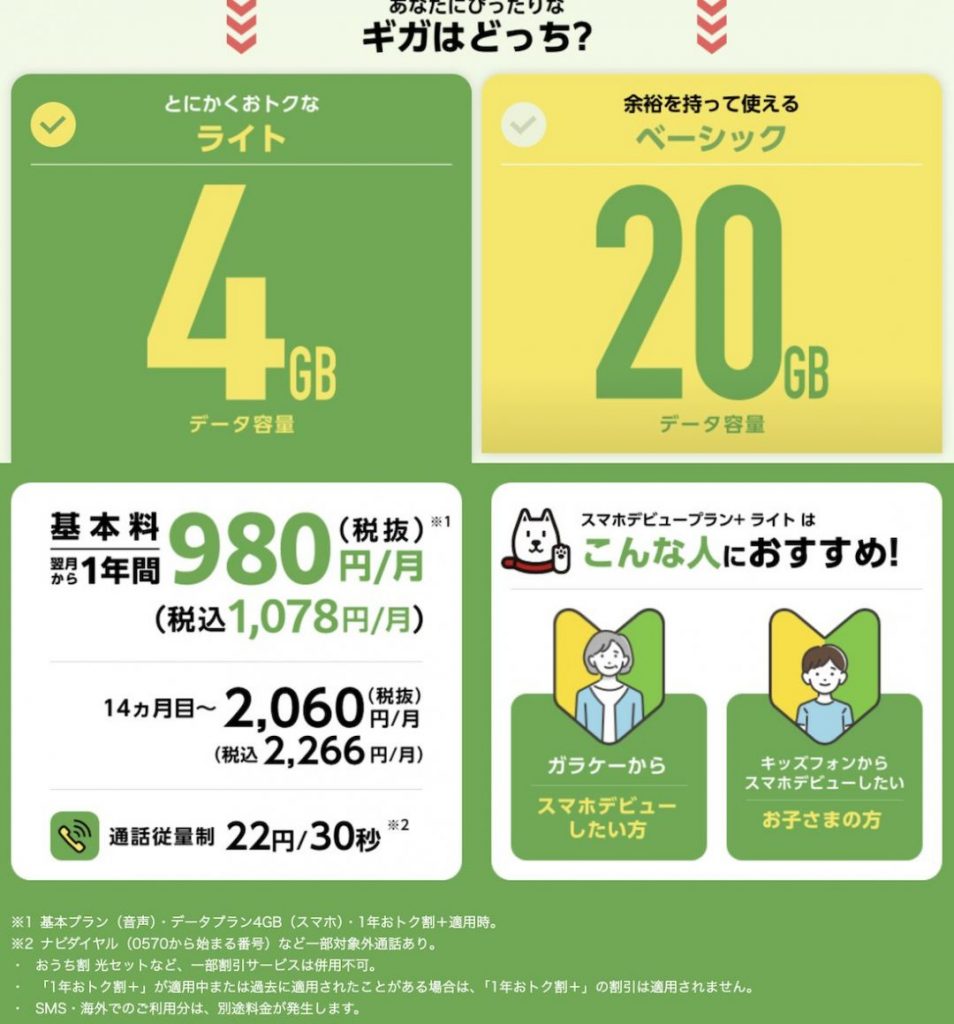 ワイモバイルの場合、新プラン「シンプル3」だと、5GB/3,058円で60歳以上通話割引(1,100円引き)が使えます。