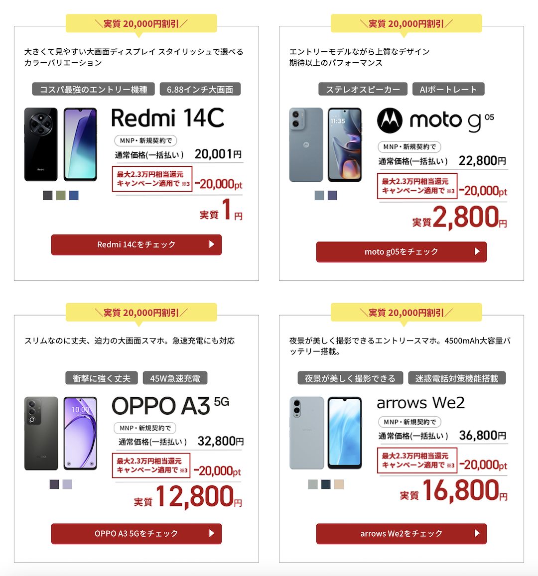 他社回線からの乗り換えまたは新番号で契約 <対象の1円端末:MNP/新規契約> moto g66y 5G:1円/3,980円 moto g64y 5G:1円/9,800円 Samsung Galaxy A25 5G:1円/9,800円 nubia S 5G:1円/1円 OPPO A3 5G:1円/1円 AQUOS wish4:1円/1円 |