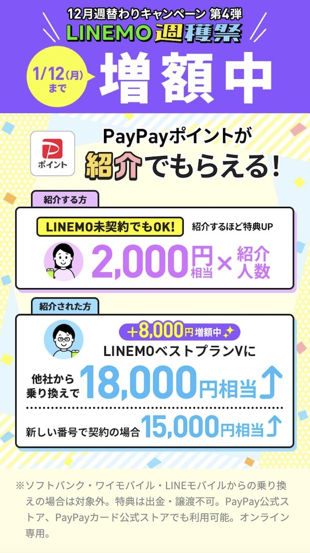 被紹介者は、MNPでの乗り換えの場合は18,000円相当、新規契約の場合は15,000円相当のPayPayポイントが進呈。(※8,000P増額中。1月12日まで)