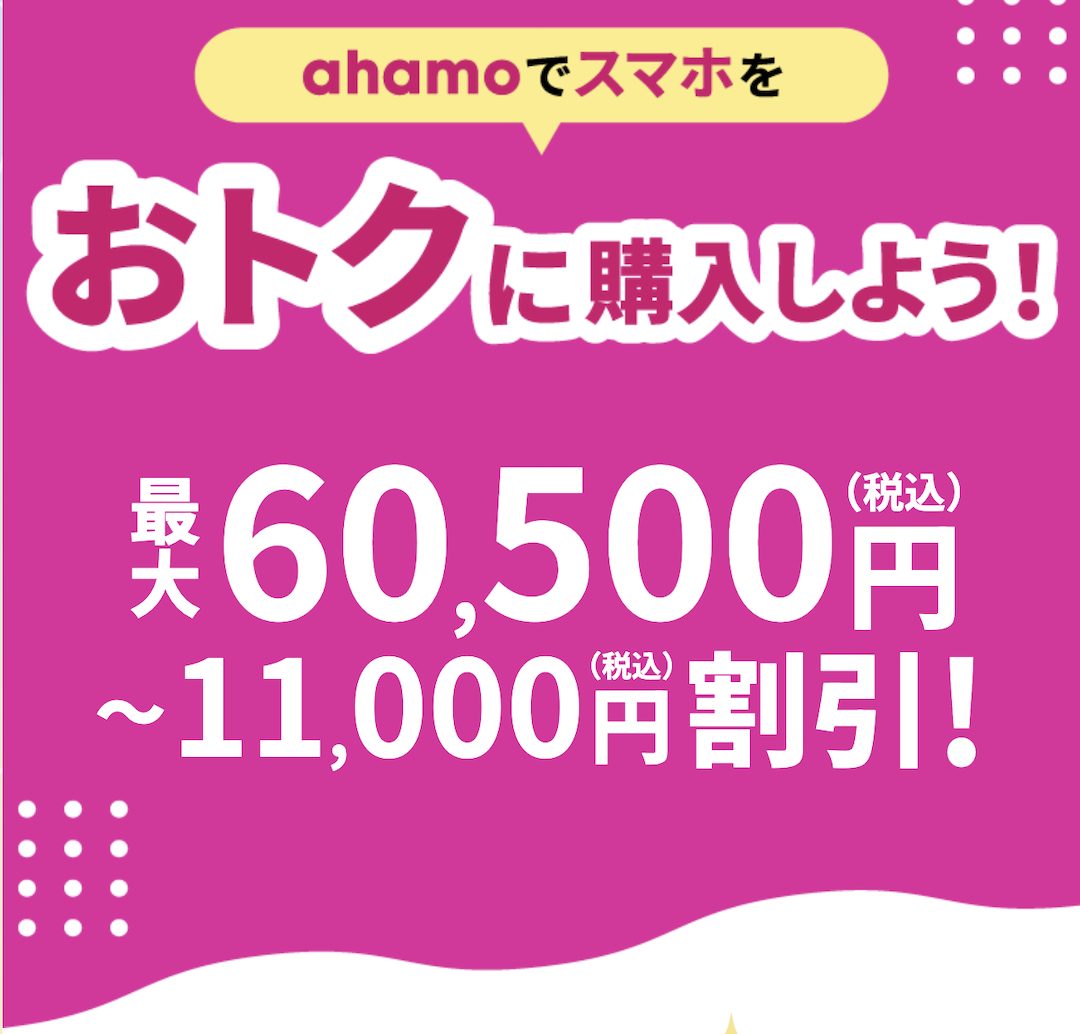 ahamoの新規契約または他社からの乗り換えで機種変更すると、対象機種が割引されるキャンペーンです。