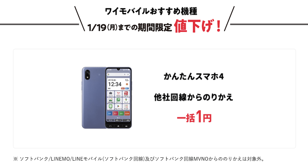 ■ワイモバイルの1円スマホは、新規契約や他社から乗り換えなどの条件あり