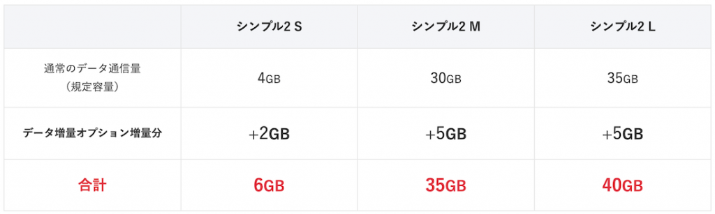データ増量オプションは、シンプル2 Sなら月2GB、M/Lなら月5GBを追加できる便利なサービスです。