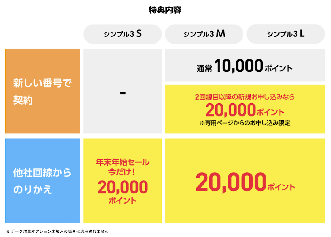 他社回線からの乗り換えの場合 新番号で契約の場合 シンプル3 S:ー データ増量オプション