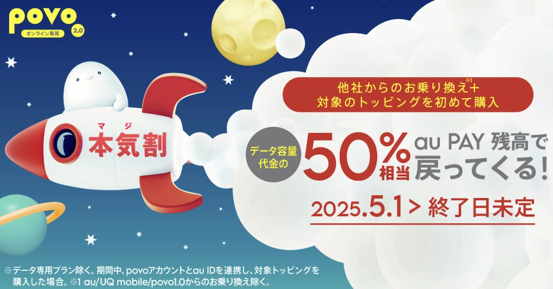他社からpovo2.0へMNP乗り換えし対象トッピングを購入すると、au PAY 残高に半額相当(不課税)が還元されるキャンペーンです。