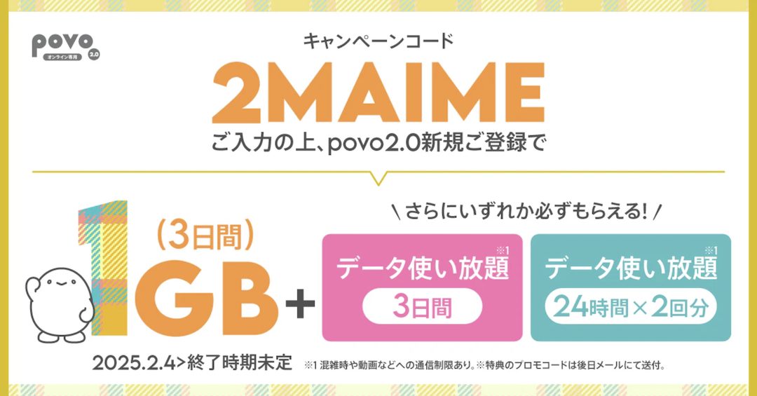 povo2.0新規加入時にキャンペーンコード「2MAIME」を入力すると、1GB(3日間)&データ使い放題*3日間もしくは24時間×2回が貰えるキャンペーンです。
