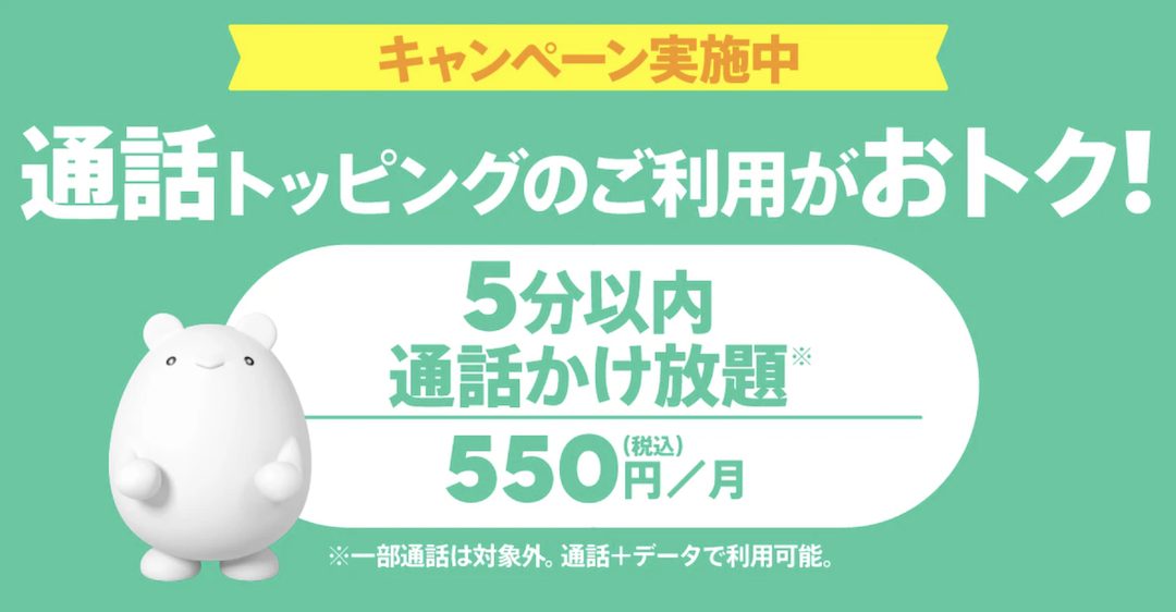 - かけ放題デビューキャンペーン(新規加入または他社から乗り換えで「かけ放題」トッピング代550円がau PAY 残高で戻ってくる)